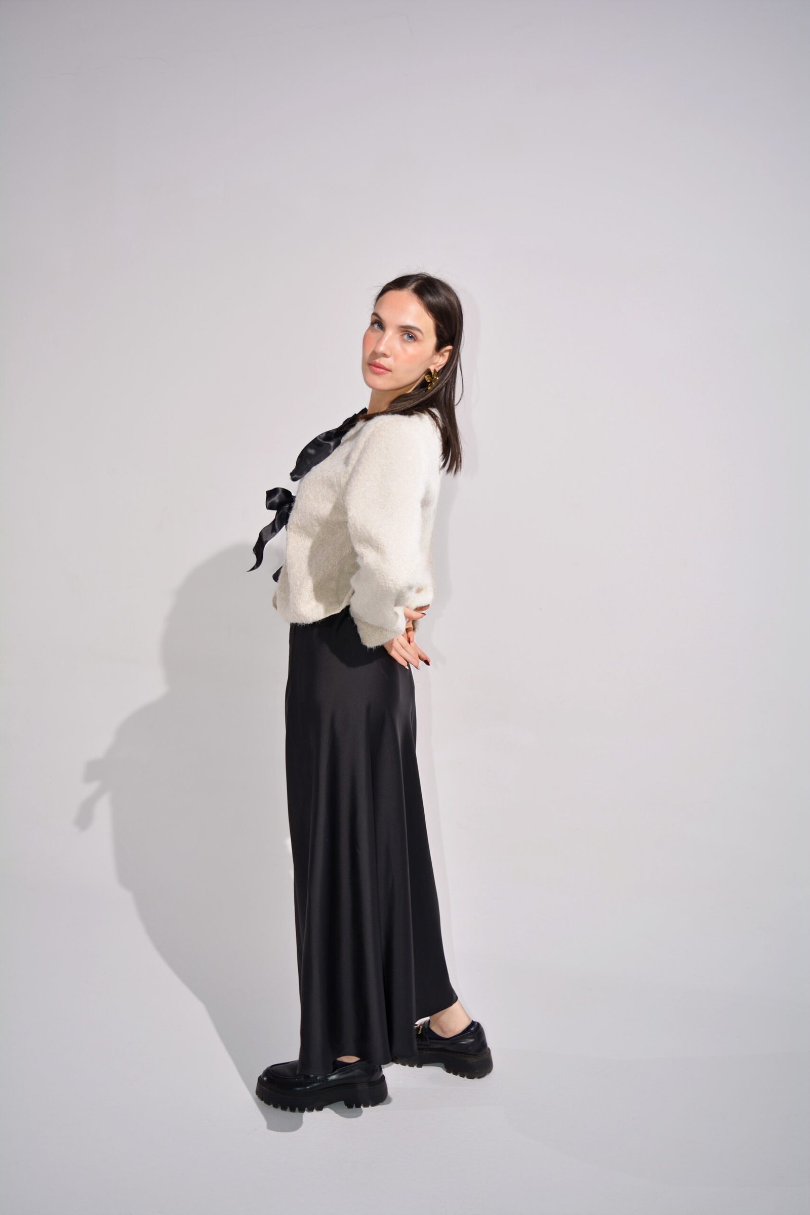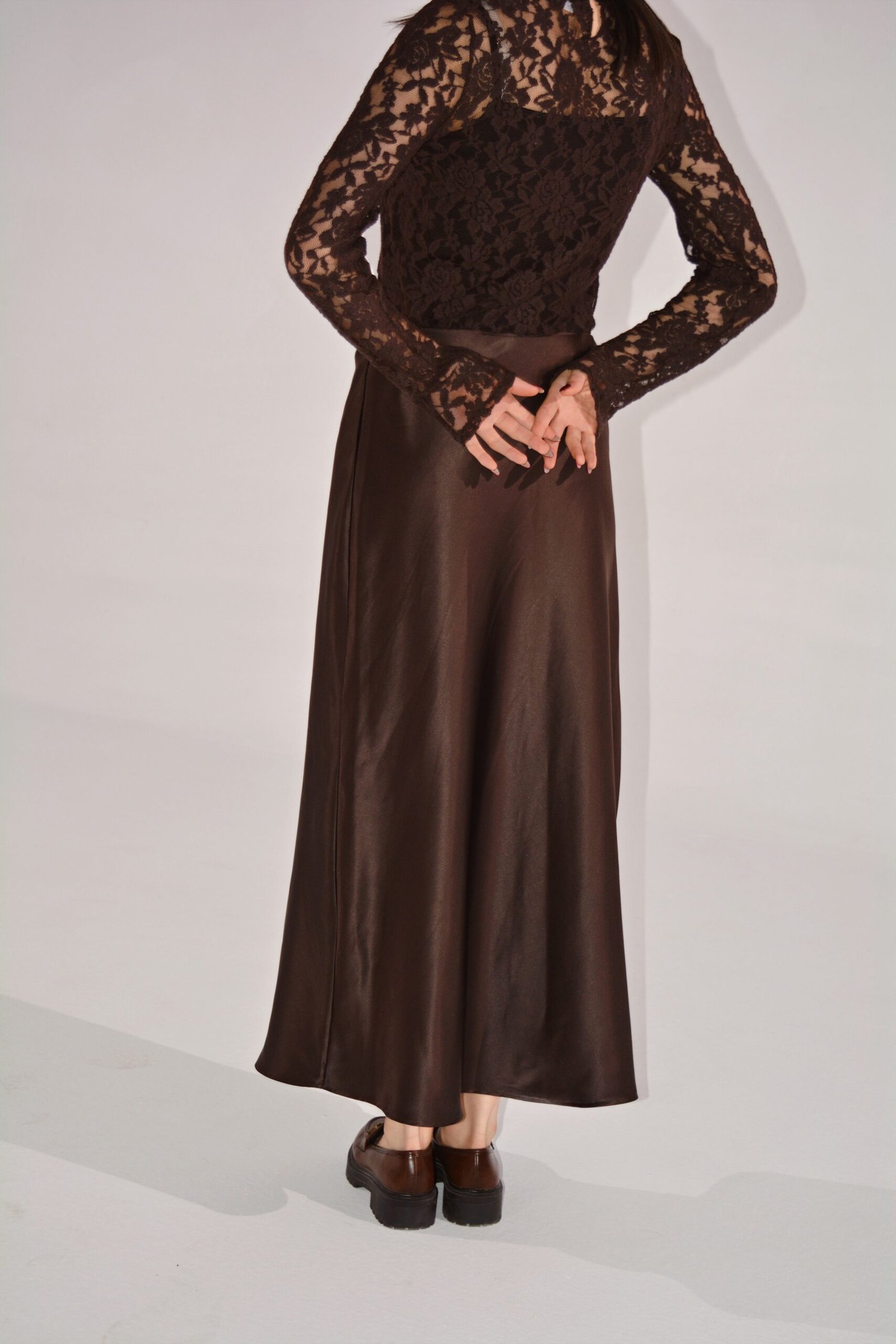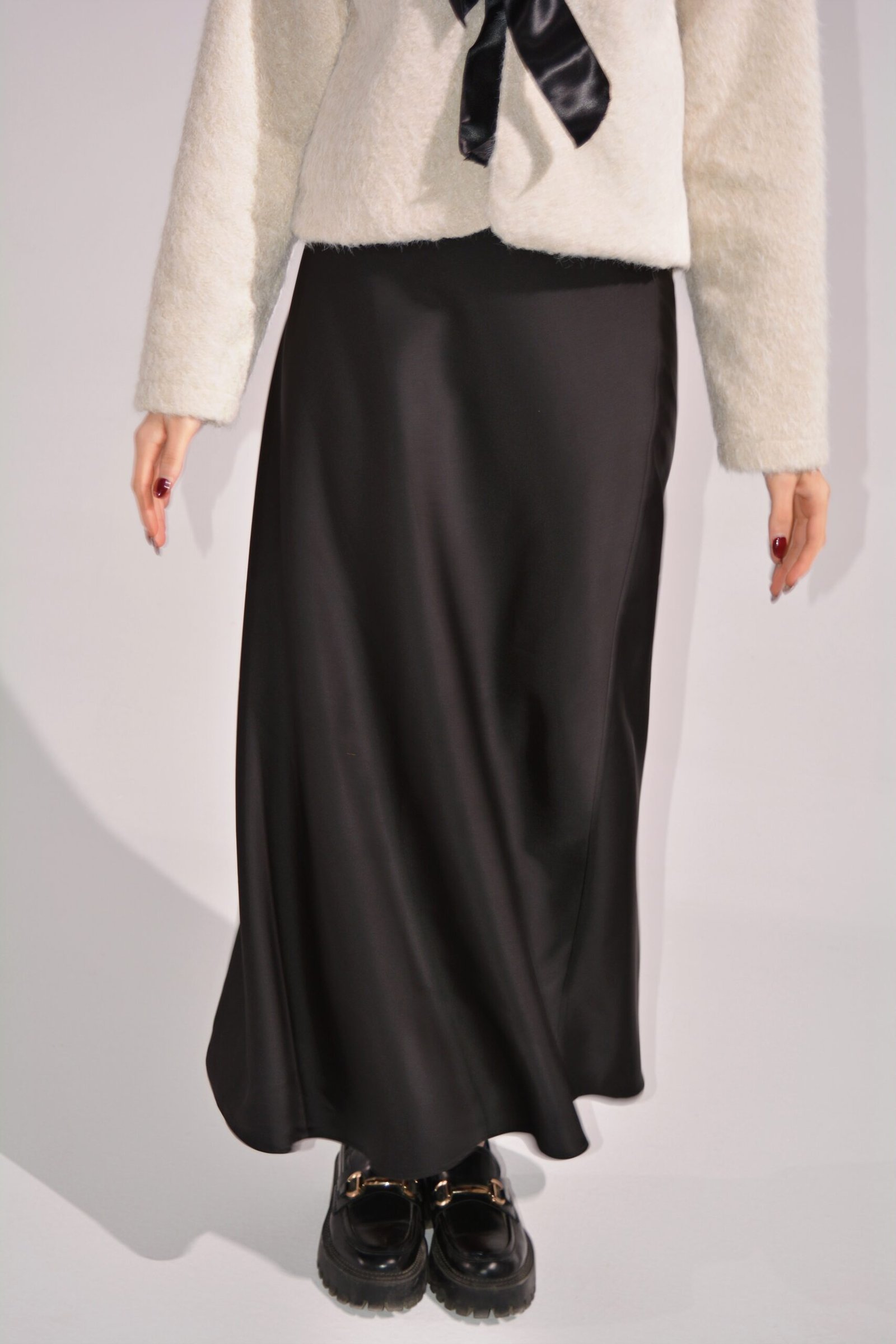 Cette jupe midi en tissu à effet satin séduit par sa fluidité et son élégance naturelle.